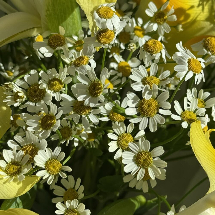 На фото букет из желтых ирисов и ромашек. В составе: ирис 7 шт, танацетум 10 шт, дизайнерская упаковка 2 шт, атласная лента 2 шт, . Все цветы свежие и ароматные, букет красиво оформлен и отлично подходит для подарка. Доступна доставка цветов или самовывоз.