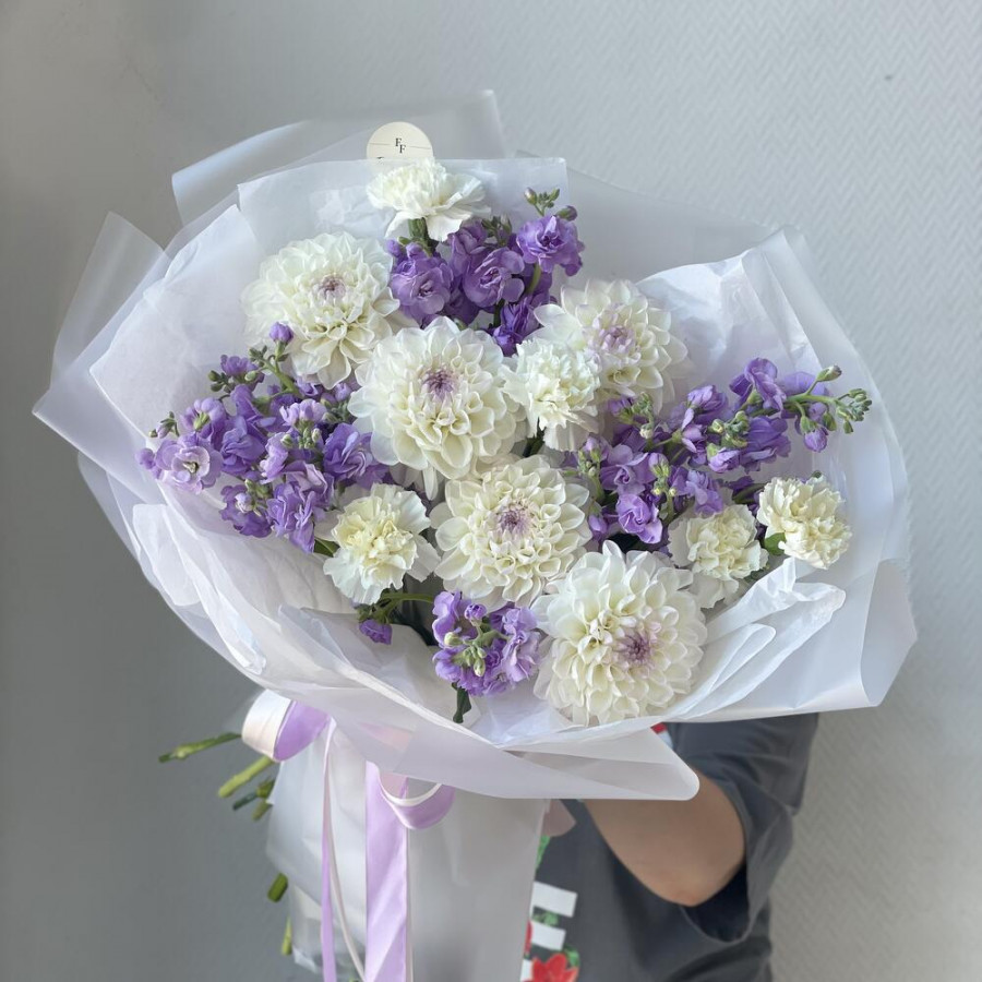 На фото букет «сиреневое облако». В составе: георгина 5 шт, маттиола 4 шт, гвоздика 5 шт, дизайнерская упаковка 1 шт, атласная лента 1 шт, . Все цветы свежие и ароматные, букет красиво оформлен и отлично подходит для подарка. Доступна доставка цветов или самовывоз.